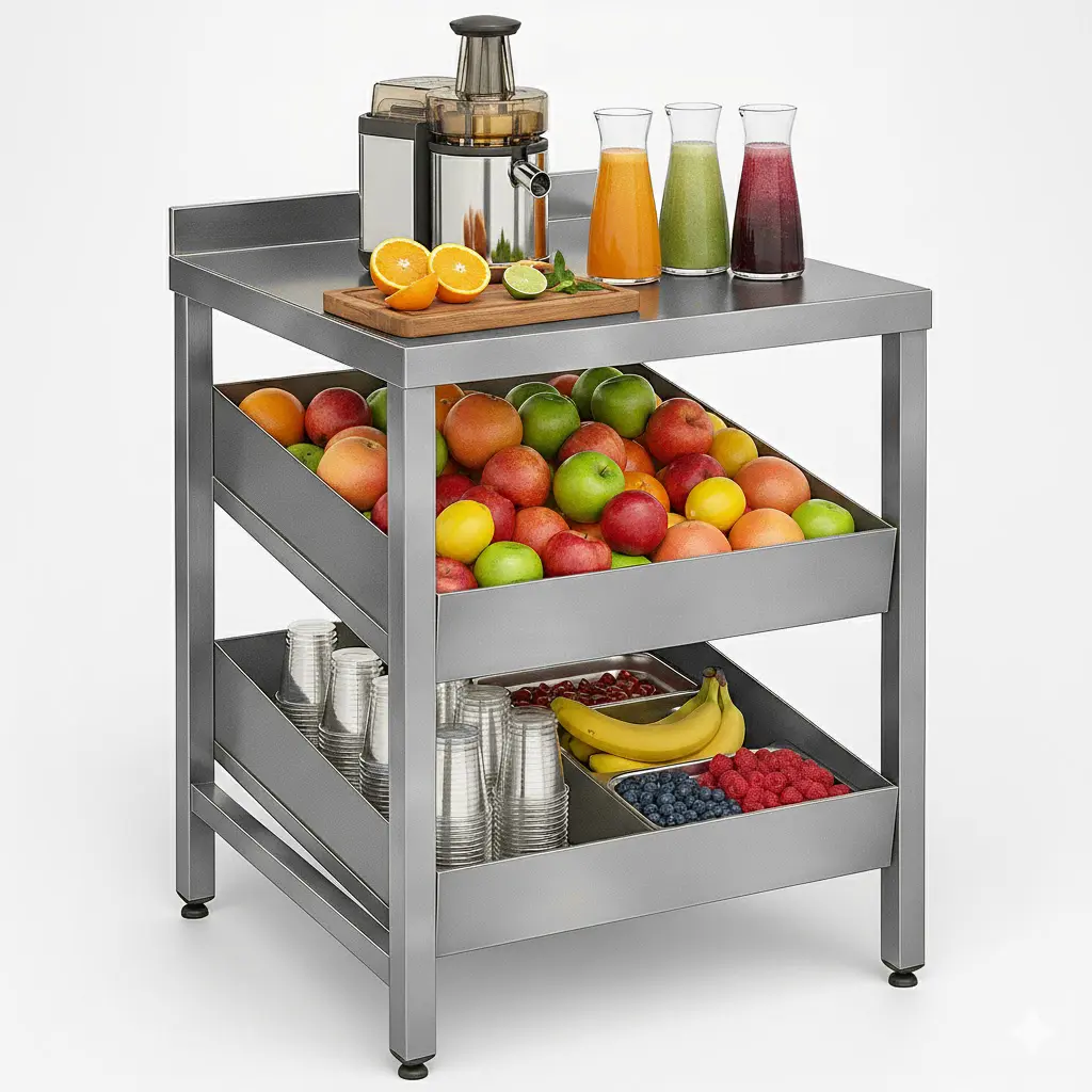 Фреш-станція бармена — це компактний професійний модуль для швидкого та зручного приготування свіжих соків, напоїв і заготовок. Виготовлена з харчової нержавіючої сталі, вона стійка до вологи, кислотності фруктів та інтенсивного щоденного використання.